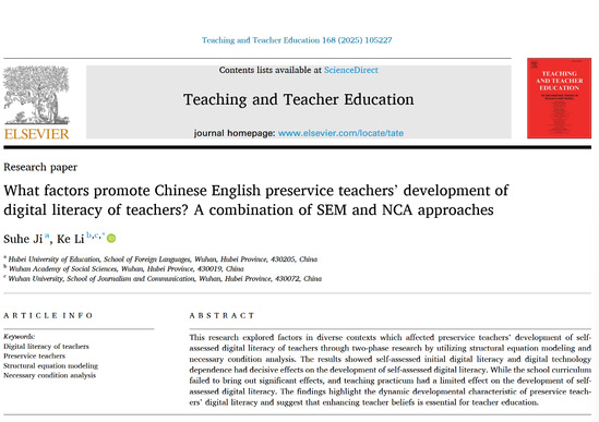 本网讯(通讯员 金汤)近日,外国语学院季苏鹤老师以第一作者身份(湖北第二师范学院为第一单位),与武汉市社会科学院李轲博士合作,在教育学国际顶级权威期刊《教学与教师教育》(teaching and teacher education)发表题为《哪些因素促进中国英语职前教师的教师数字素养发展?——基于结构方程模型(sem)与必要条件分析(nca)的混合方法》(what factors promote chinese english preservice teachers’ development of digital literacy of teachers? a combination of sem and nca approaches)的研究成果。